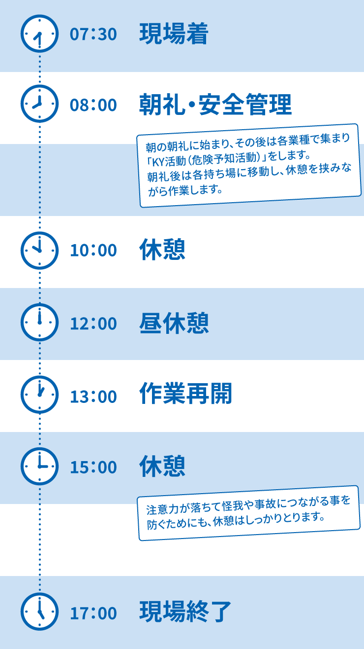 | 勤務時間 | 8:00~17:00 ※直行直帰が多いです! |