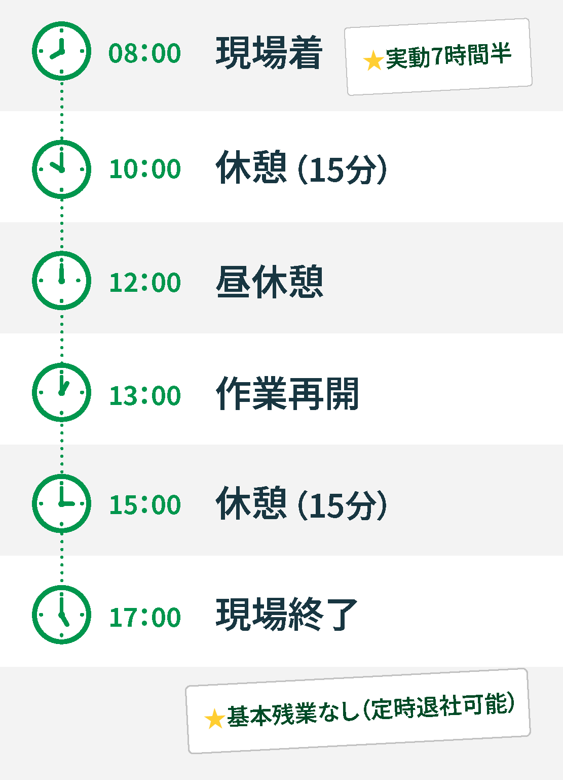 | 勤務時間 | 08:00~17:00(実動7時間半) |